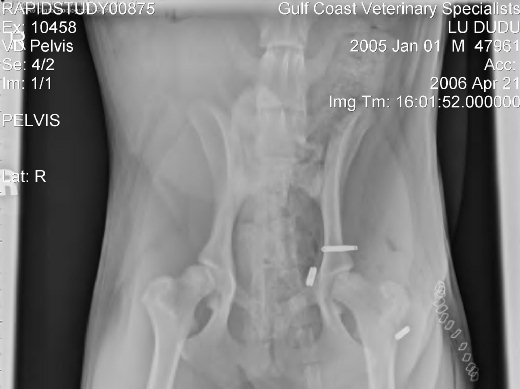 醫師看了X光片,和我們討論嘟嘟的傷勢:左前肢呎骨雙雙斷裂,要以支架固定,比較簡單。左臀部大腿骨關節錯位,並且部分磨傷,需以鋼釘穿過關節並在兩頭固定之。手術要等第三天才排到嘟嘟,再休息兩天才出院,先付一半費用約2,500美元,出院時再付餘款。