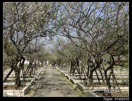 這次去士林官邸拍梅花,玫瑰園裡的兩條步道兩側共栽植四列梅花,清一色的白青梅,感覺侷限在窄狹的花床裡,長得不是很健康,花況也不甚整齊!