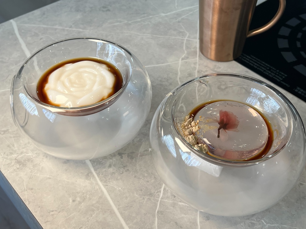 玫瑰花造型的白玉杏仁豆腐,杏仁香氣很迷人,搭配黑糖漿甜而不膩~水滴櫻花玄餅搭配黃豆粉及黑糖蜜,簡單卻相當美味,傳統的日式甜點在新肉多多就能吃到