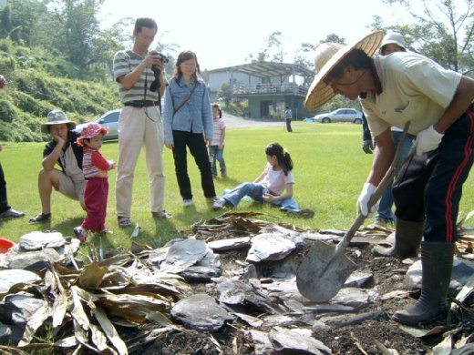 中午時分回到農場,陳主任正忙著拿圓鍬開窯,大家趕忙迎上去一探究竟。炕石板窯是原住民就地取材,傳統的燒烤食物方式,不浪費能源,石板亦可重複使用,只見他小心翼翼的鏟開石板與月桃葉,烤雞的香氣「奪石而出」,還有地瓜、芋頭等食料,高溫悶烤之下,早已熟透。桌上另有石板烤肉、龍葵葉湯,如果還有檸檬、蒜苗佐味,那就更棒了。