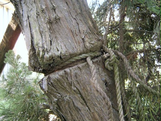 仔細端詳一番,哎呀!原來是樹幹不知被哪個糊塗鬼用麻繩給勒住了,猜想大概是古早前為防颱風,藉外力來固定樹木生長方向吧。看樣子不想個法子幫忙解套,樹根的養分輸送不到樹葉,大概活不久了!