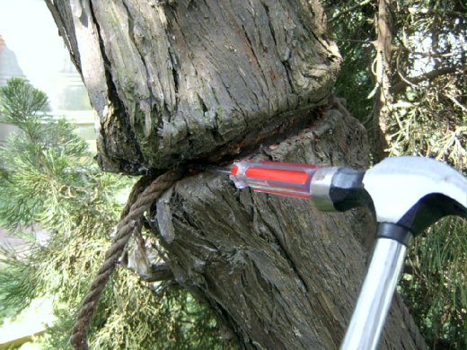 我順手拉拉繩索,才發覺冰凍三尺非一日之寒,纏繞三兩圈的繩子早已「入木三分」了,光憑手力根本無濟於事、絲毫動彈不得。回去找了小刀、鉗子,一點一點割斷,再夾出陷在樹皮裡頭的繩子,無奈力道不夠,進展有限;只好又回去翻出螺絲起子和鐵鎚,心想「工欲善其事,必先利其器也」,既然要救,就奮戰到底。