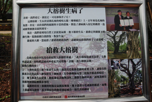 孔廟及忠義國小是停留較久的地點,園區中一棵體型最壯大,卻感染褐根病的老榕樹正在接受專業的治療啊!一年多前瑞光即發現這棵大成殿前方地標的珍貴百年老榕樹枝葉稀疏,病況岌岌可危,經清點附近共有十一棵老樹得病,包括九棵榕樹、二棵茄苳樹,其中,忠義國小內就佔了七棵,一棵已枯死了,孔廟內則有四棵。老樹群會得病,主要是面臨不當的修剪及或是配合工程被斷根,造成老樹染病而命危。老榕的樹幹老化,新長成的鬚根應讓它生長才對,但現在卻為美觀而修剪斷,造成無法長成新根輸送養份。這棵老榕樹樹齡約一百二十年、樹冠面積