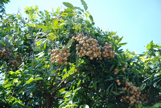 最近氣候炎熱,苗圃旁這幾棵高大的龍眼樹早已結實累累,我們到時已有鋸下現成的樹枝放在蔭涼處,慢慢撿就好,外頭怪手正工作起勁著,配合爬上樹的鋸樹工人將帶果實的樹枝拉下來,看似粗暴的行為,但據說如此一來隔年反而會結更多果實。