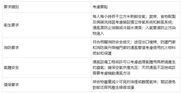 以下表格整理咗香港食環署對食肆通風設備工程嘅一啲建議要求:
