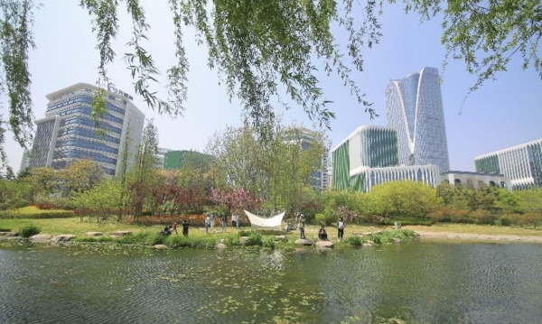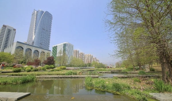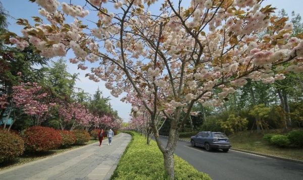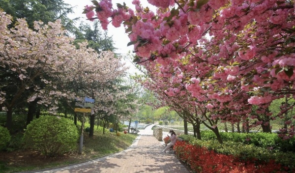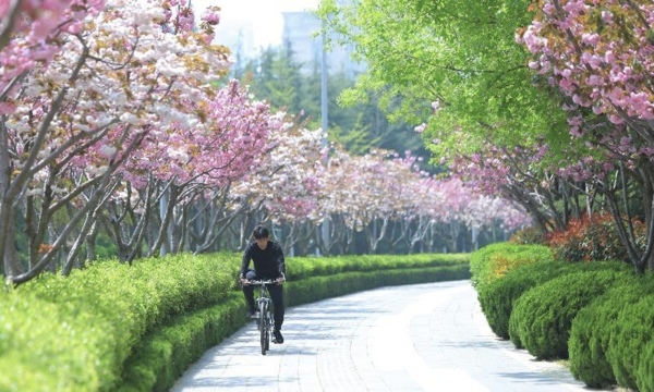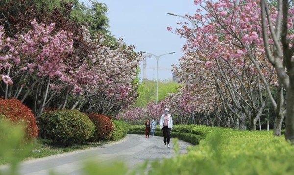 位於山東省青島市李滄區的李村河兩岸鮮花盛開,春景如畫,遊客在這裡觀景、騎行、垂釣、散步,感受大自然的美好。