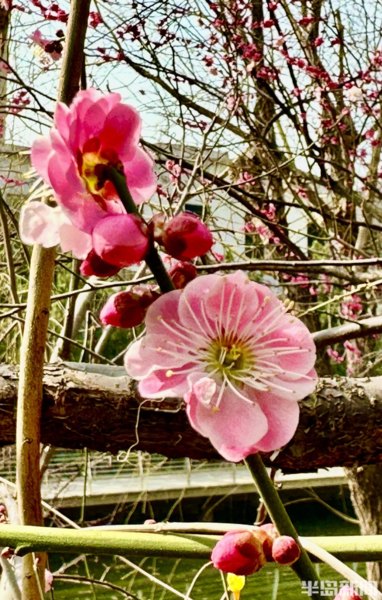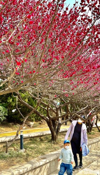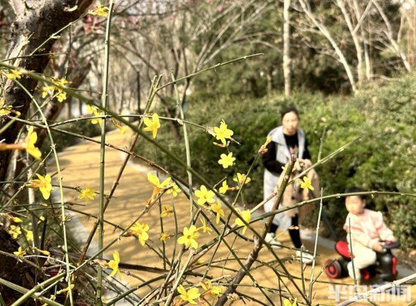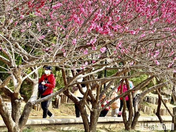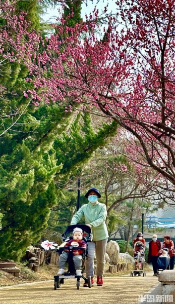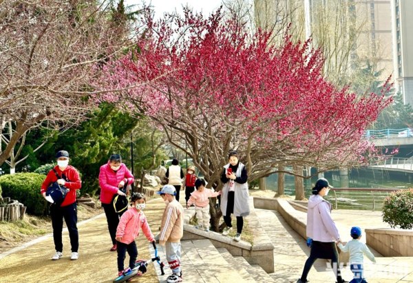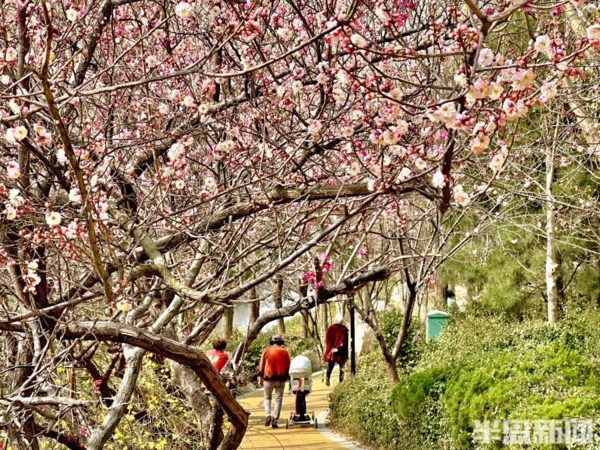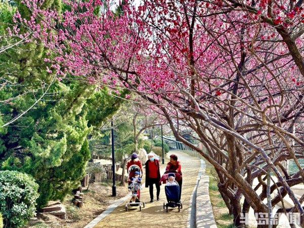 青島李滄區大村河沿岸的梅花、迎春花、玉蘭花等盛放