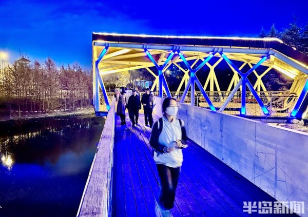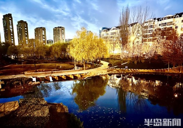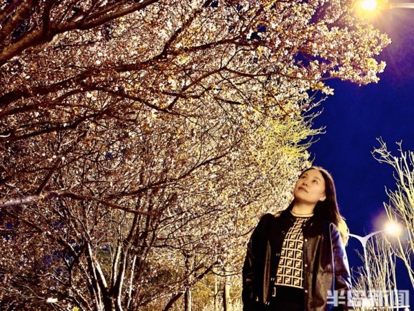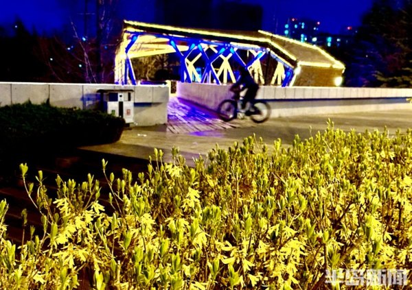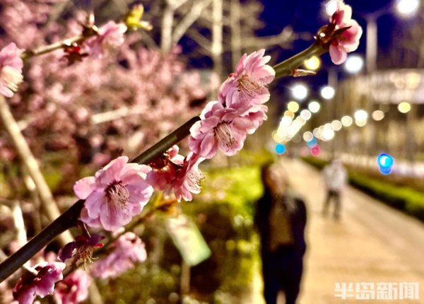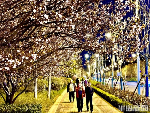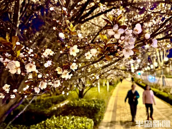 青島李村河畔的玉蘭、紫葉李、梅花……次地開放,沿河邊休閒棧道,一路行走一路生花,紅、粉、黃、紫等各色各類鮮花競相開放,花開一朵朵,花團一簇簇,春光下的李村河,正徐徐展開一幅萬紫千紅的生態畫卷。在夜色下與燈光相映成趣,形成一片別樣美景,