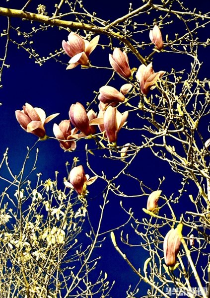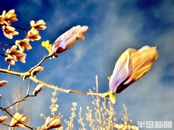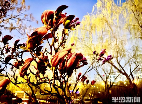 青島李村河畔的玉蘭、紫葉李、梅花……次地開放