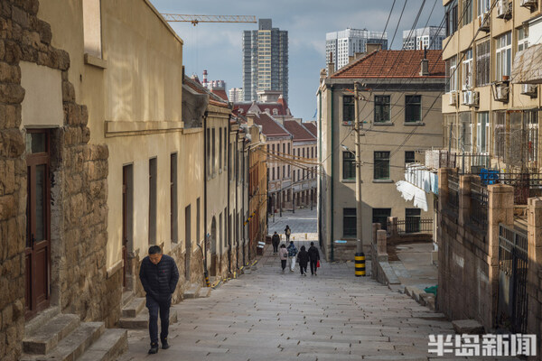青岛老城区黄岛路上的老里院街区。石板路是黄岛路的标志,因其特别的长度及铺设方式,使得一般成年人的步伐都不能实现“一步一个台阶”,因此老青岛人又称其为“一步半”。