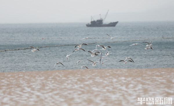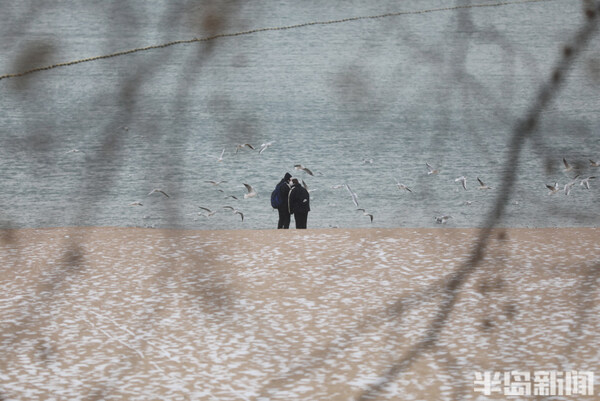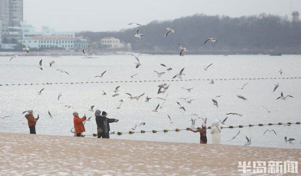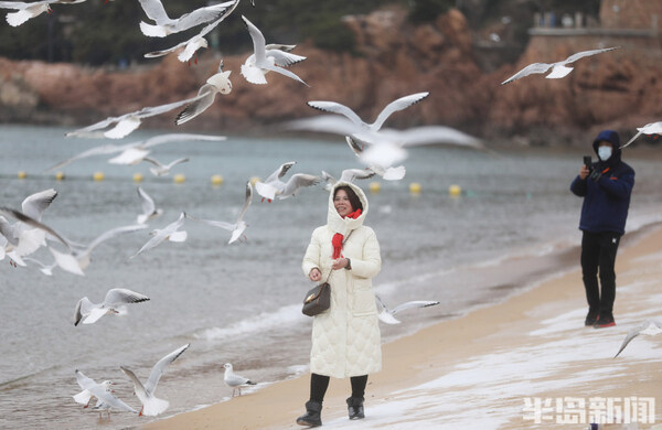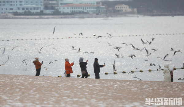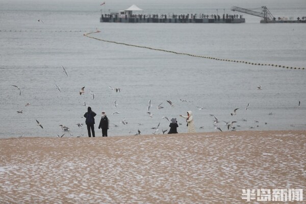 青島第一海水浴場,雪花覆蓋著沙灘,遊客在觀賞雪景的同時與海鷗互動,一邊餵食物,一面拍照留念。