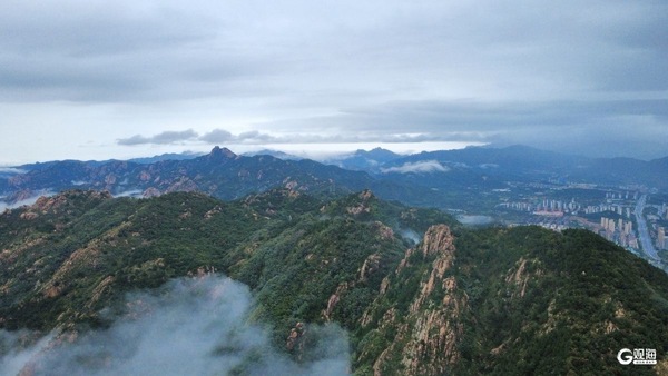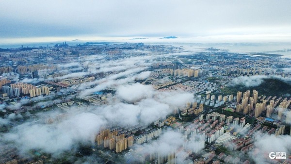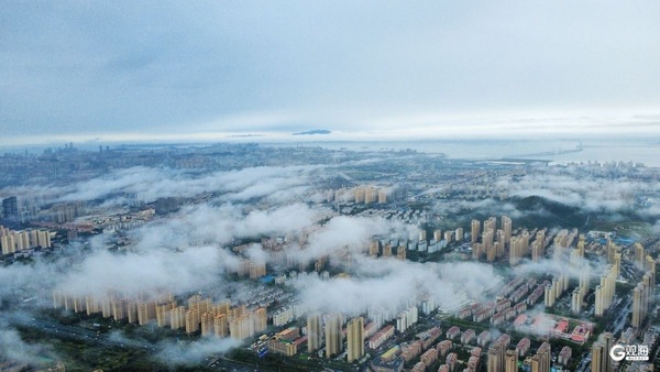 青岛李沧区卧龙山上演云絮裹山海大片