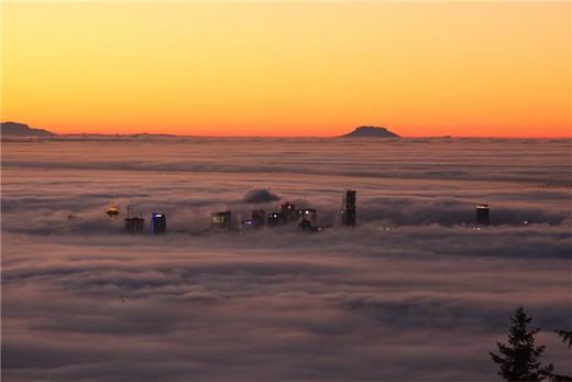圖片:由上山滑雪的溫哥華居民所拍攝,圖中穿越層層濃霧的高樓即是溫哥華的 downtown