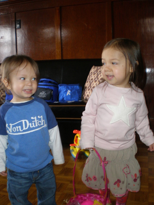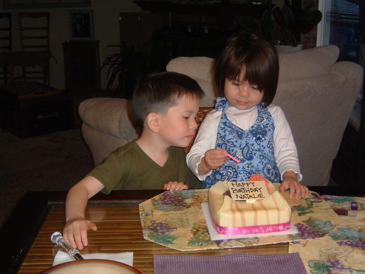 另一方面,因為與女兒住在同一個城市,也因為她的兩個孩子年齡太近的關係,因此我們盡量每個星期兩三天去她家,一方面幫她”看頭顧尾”,另一方面也多了和小孫子玩的機會。如此一來, 我們和女兒的兩個孩子有較多的接觸與互動。三歲半的愛珊語言能力很強,一歲半左右就能說完整的句子;現在,聽到儼然大人口氣的話從她小不點的個子的嘴裏說出來,讓人覺得很好玩。她膽子比較小,也非常聽話。喜歡聽大人讀書。雖然還不識字,記憶特佳,常常可以把一本書背得滾瓜爛熟。有時,我唸書給她聽、多翻了一頁而不自覺時,她會馬上提醒我說:”You missed a page!” 她也愛唱歌,常常聽了幾遍之後,就可以跟著CD唱起來,而且唱得歌詞一字不漏,讓人嘖嘖稱奇。她現在開始學芭蕾舞,沒事時,常常在客廳一個人做出各種舞姿,有時也拉著將近兩歲的弟弟一起旋轉、蹦跳,說是在"表演"。有時跟他們玩累了需要坐下來喘一口氣時,撒嬌的她會跑過來抱著我說:”I love you very much!”,聽得我再累也值得了!凱智是男孩,較活潑、好動。也因為好奇心強、喜歡攀爬,就容易摔交,他看到我們的第一句話常常是:”I fell yesterday.”,接著,指著碰撞的地方,要求 “kiss it”以便”消除疼痛”,可愛極了。 通常我們會用大紙箱裝他們喜歡吃的食物帶去。每次我們到了,凱智都會爭著要抬紙箱,還一盒一盒地”檢視”,同時大聲告訴他姐姐我們帶了什麼來。他也許受了姐姐的影響,相當喜歡音樂,尤其是睏了想睡覺時,不過,要聽什麼他都有他的選擇,放錯了CD,他都會很堅持地告訴我們他要的片子。有一次我們同在我的小姨子家作客,午餐過後是他該午睡的時候,他眼睛半閉地讓我抱著,嘴裏卻習慣地說:”music!”我告訴他姨婆家沒有music,問他我可不可以唱歌代替,也許他很睏,竟然點點頭,之後,就在我的”嬰仔惜,一暝大一呎”的老台語搖籃曲聲中睡著了。看著他天真無邪的臉龐,讓我忍不住地又親了他一下。