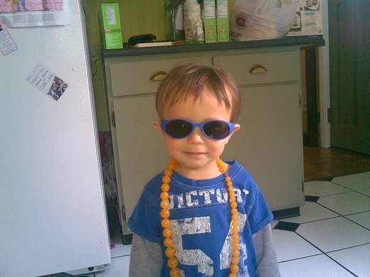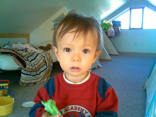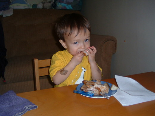 最好玩的是凱智的吃。兩歲的他竟然喜歡吃雞皮、魚皮,也特別愛啃骨頭。吃飯時,若看到這幾樣他的最愛,一定是大口大口的吃,不停地說:”還要”。有時,皮吃完了,我們也會偷偷地”夾帶”雞肉、魚肉塞進他嘴裏,可是他很精靈,經常看他用手把肉拿出來說:”This is not skin”,讓我們啼笑皆非。前天吃飯時,有他們姐弟倆兒都喜歡的豆腐湯,凱智一邊吃,一邊看著小豆腐條在湯裏載浮載沉,忽然”宣布”說:”I have a tofu song”,說完,自己就”tofu, tofu, swimming in the water; tofu, tofu, swimming in the water;…”地唱了起來。歌詞就那麼一句,旋律卻句句不同,有高有低,有快有慢,煞像回事。把我們都笑彎了腰,卻還是要誇獎他好棒、好有創意。