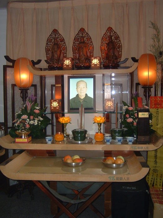 設在家中的小靈堂佈置得簡單、莊嚴。最上方的正中有西方三聖(阿彌陀佛、觀世音菩薩與大勢至菩薩)的雕像,其下是爸爸的照片,爸爸的靈位則擺在照片下方,靈位之前是個香爐。兩旁有一對大燈,底下有素雅的鮮花兩盆。供桌上有各式的蓮花燈/燭數付。在佛號不斷的襯托之下,撲鼻的花香和裊裊升空的香煙代表我們對爸爸的懷念與哀思;桌上的水果供品則是我們對佛陀與爸爸的敬意與謝忱。