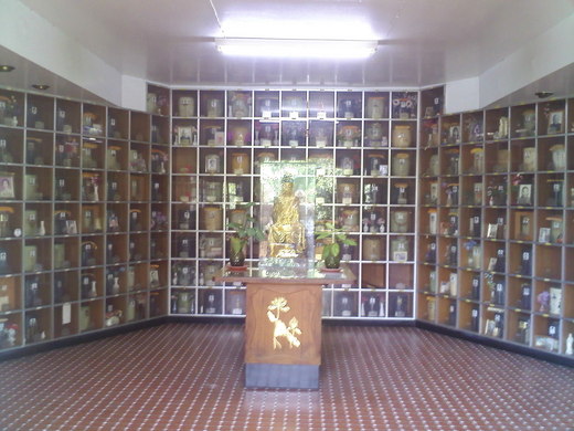 媽媽骨灰所在之處是該寺地藏靈塔的三樓大廳。該處裡面窗明几淨、光朗通風,遠眺景色秀麗、視野遼闊,是大家競相爭取的地方。師父查閱了登記簿後,一方面告訴我們已經”客滿”、只能等待有人遷移,另一方面陪著我們去看看大廳兩邊的旁廊。然而,因為旁廊比較陰暗、狹隘,我們都興緻缺缺。正在無計可施時,突然那位師父發現有個因剛剛遷出、卻尚未登錄的空位。那個位子比較低,與媽媽的”家”正好遙遙相對。我們雖不是最滿意,但都表示可以接受,爸爸更半正經半玩笑地說:”這下,每天可以和你媽媽開講了!”我也笑著回了一句:開講可以,可千萬別再吵架了!
