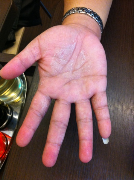 今天跟一朋友碰面,這朋友已有異位性皮膚炎多年,今天PM12:30時,幫他拍了一張原本手的模樣,後來擦了一滴薰衣草,第2張照片約過了4個小時後拍的,這時又擦了茶樹+薰衣草,第3張為晚上約10點拍的,這朋...