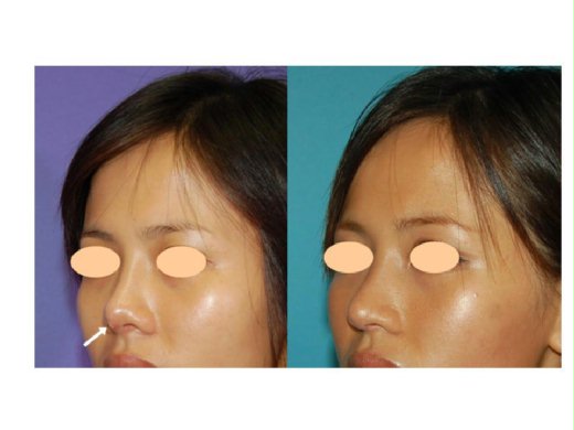 此位女性曾接受矽膠鼻骨植入物(箭號指處)後發生感染及排出,接受全自體軟骨鼻整形,將矽膠物更換成肋軟骨後,鼻部皮膚發炎腫脹情況已獲改善,鼻部外觀較術前自然許多。