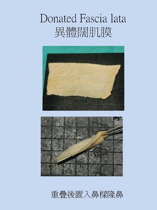 國內今年引進美國生產的人體加工肌膜,可以做為隆鼻用途,排斥及感染機會低,可以跟組織結合在一起,對於本身鼻子皮膚過薄的人,也可用於加入墊片的效果。