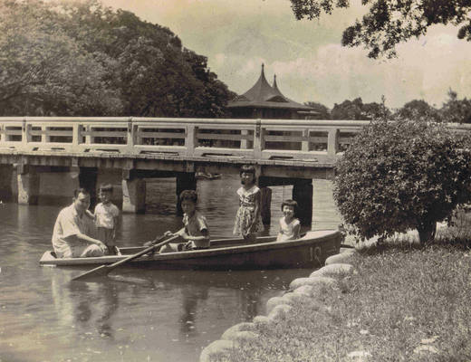 台中公園, 我們也玩遍了. 還坐划船遊湖四周 ,不成比例的兩邊,重量 造成了有趣的畫面, 父親的超重量, 把小船的一頭壓得低低的, 至今一看照片, 還覺有趣!