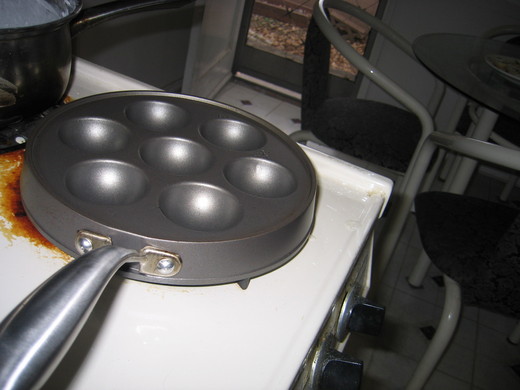 Wait a few seconds before spooning the rice batter into each indentation to about