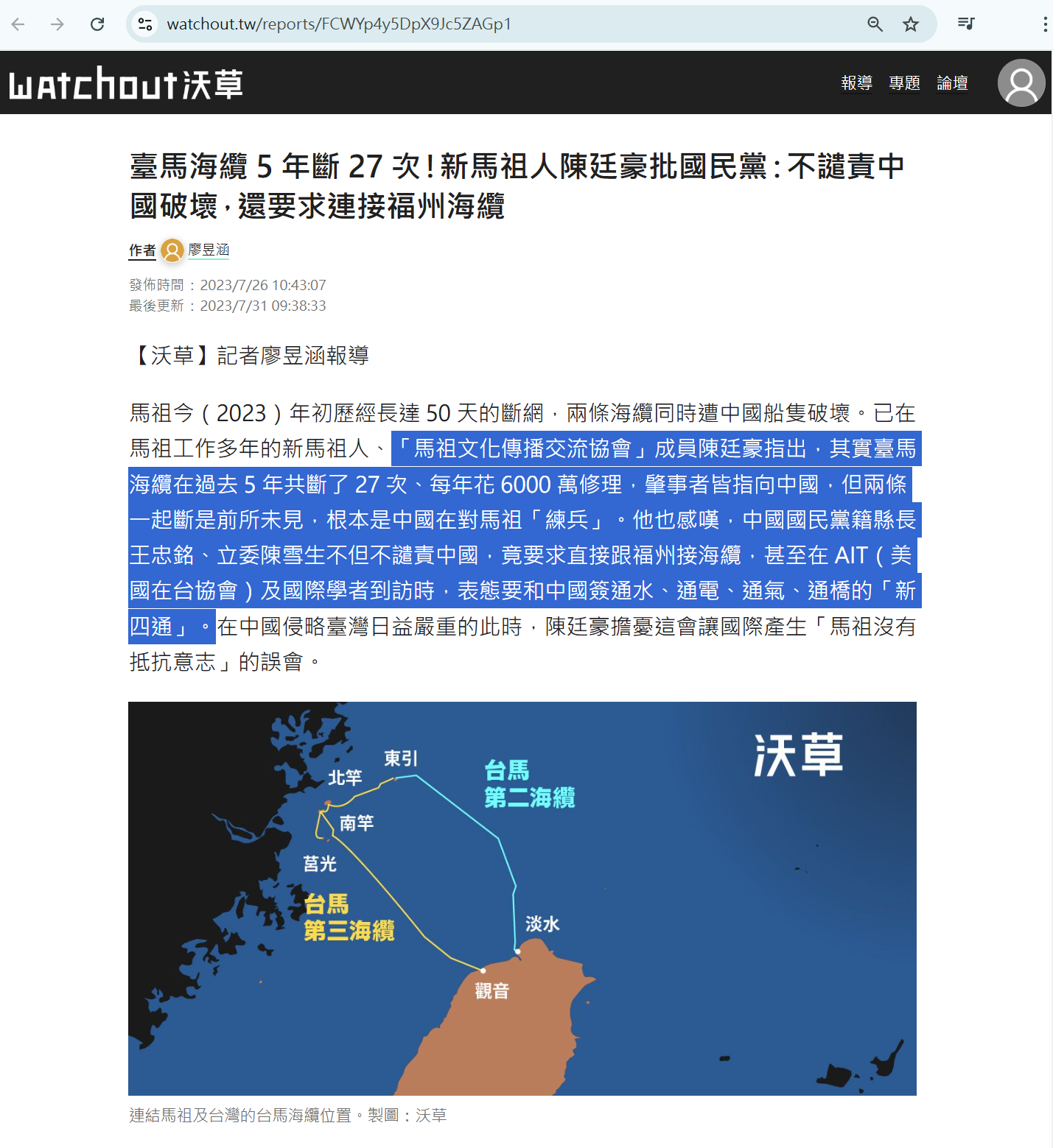 就在去年的 2 月 (2024 年 2 月),台灣與馬祖的兩條海底電纜,分別於 2 月 2 日與 2 月 8 日,疑似遭到中國漁船扯斷,這 2024 年 2 月的兩次,再加上之前五年台馬海底電纜斷 27 次,加總起來已經有 29 次,每次的維修費用都是新台幣六千萬起跳,而這 29 次的疑似肇禍者都指向中國船隻,但馬祖的國民黨立委與民代,都不敢罵中國、全部都只罵台灣,甚至要求台灣民選政府開放馬祖跟中國直接通水、通電、通氣、通橋、以及通電纜(真的希望台灣能撤軍金門與馬祖,也就是施明德先生在生前所提出的金馬撤軍論主張,並將金門與馬祖交由它們自己決定,是要獨立生存還是歸順中國)。