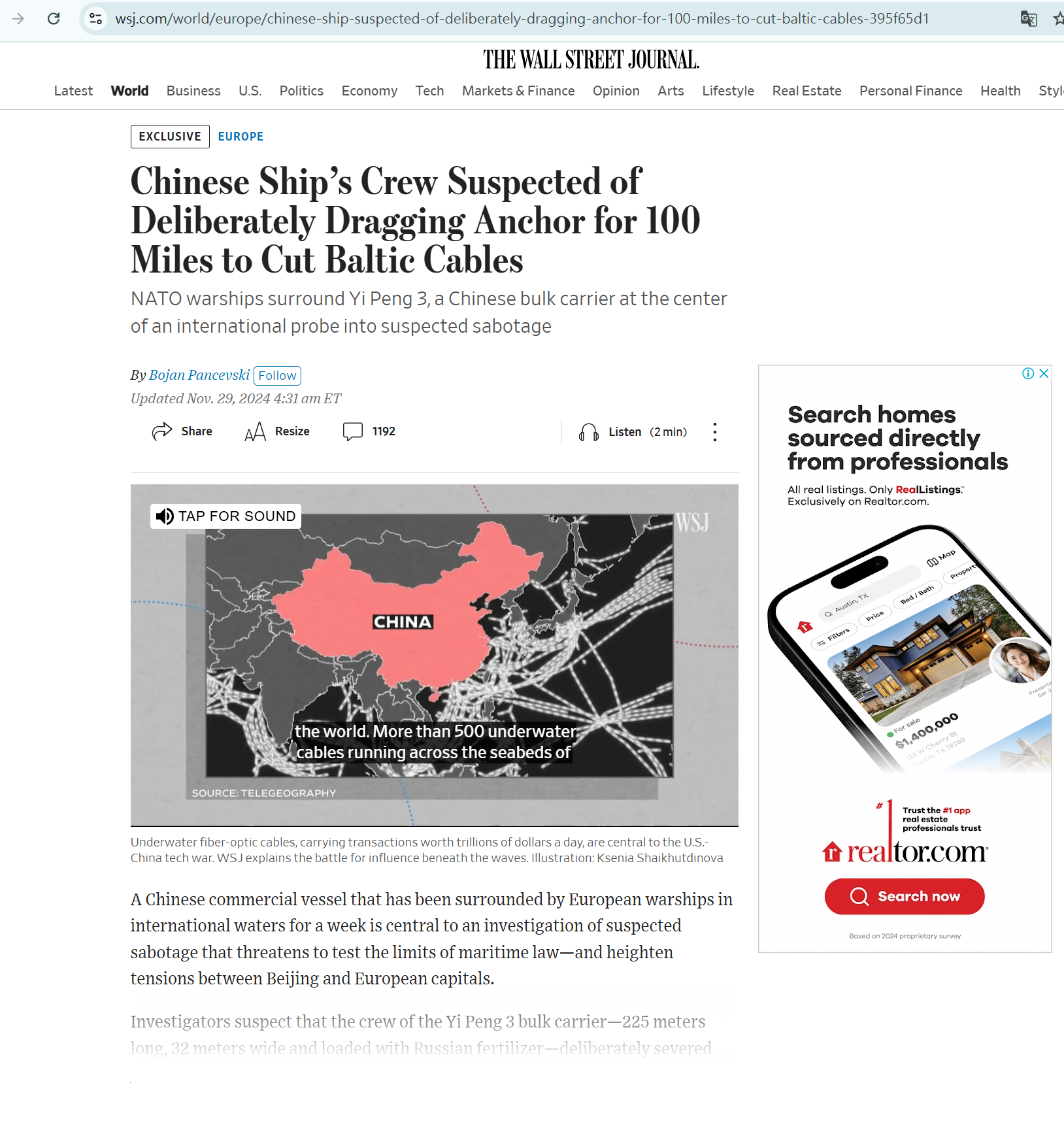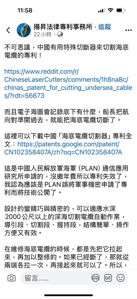 你以為中國的權宜船只在台灣附近練習切斷海底電纜嗎?實際上,中國權宜船不但疑似在歐洲也在練習切斷海底電纜,還特地為它們所發明的海底電纜切斷器申請了專利。
