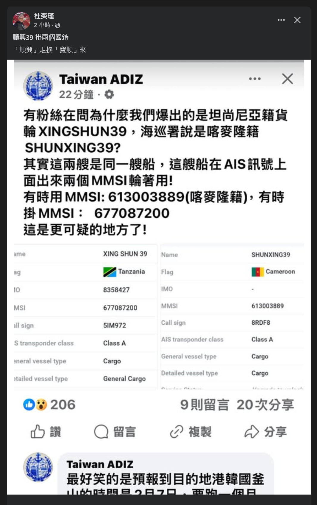 這艘中國權宜船順興 39 號,申請了兩個國籍,因此有兩個電訊呼號,它會交互使用。