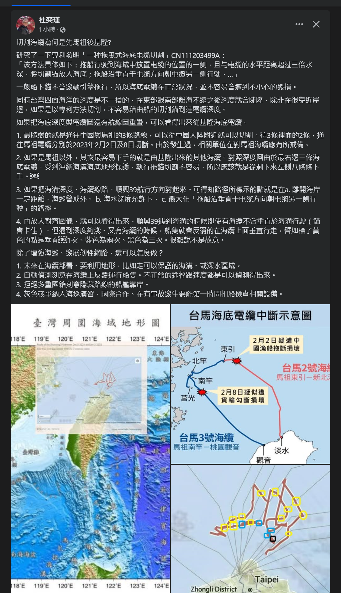 杜奕瑾先生分析中國權宜船在切斷台馬海底電纜時所使用的策略:為何是先切馬祖、後切基隆;