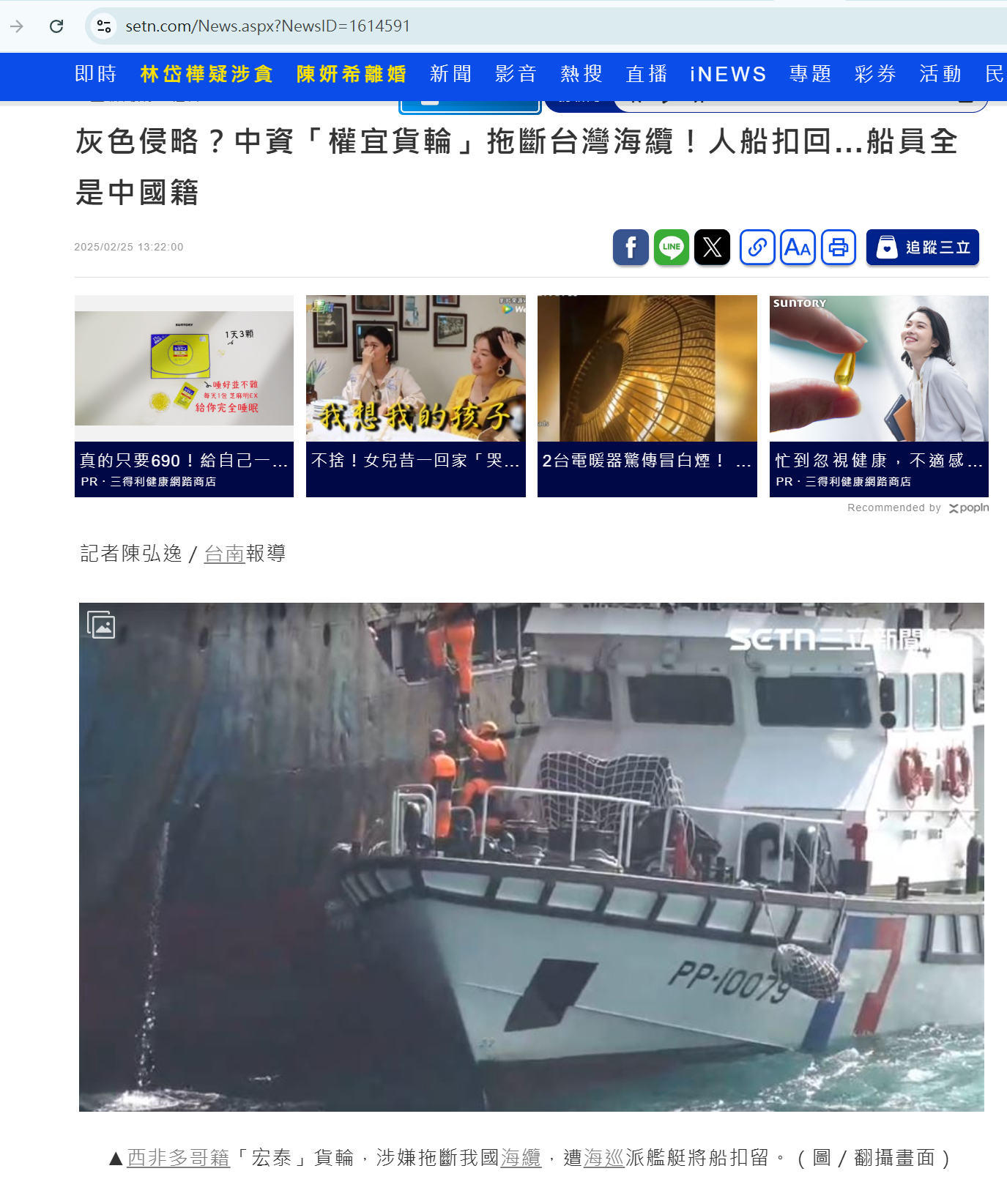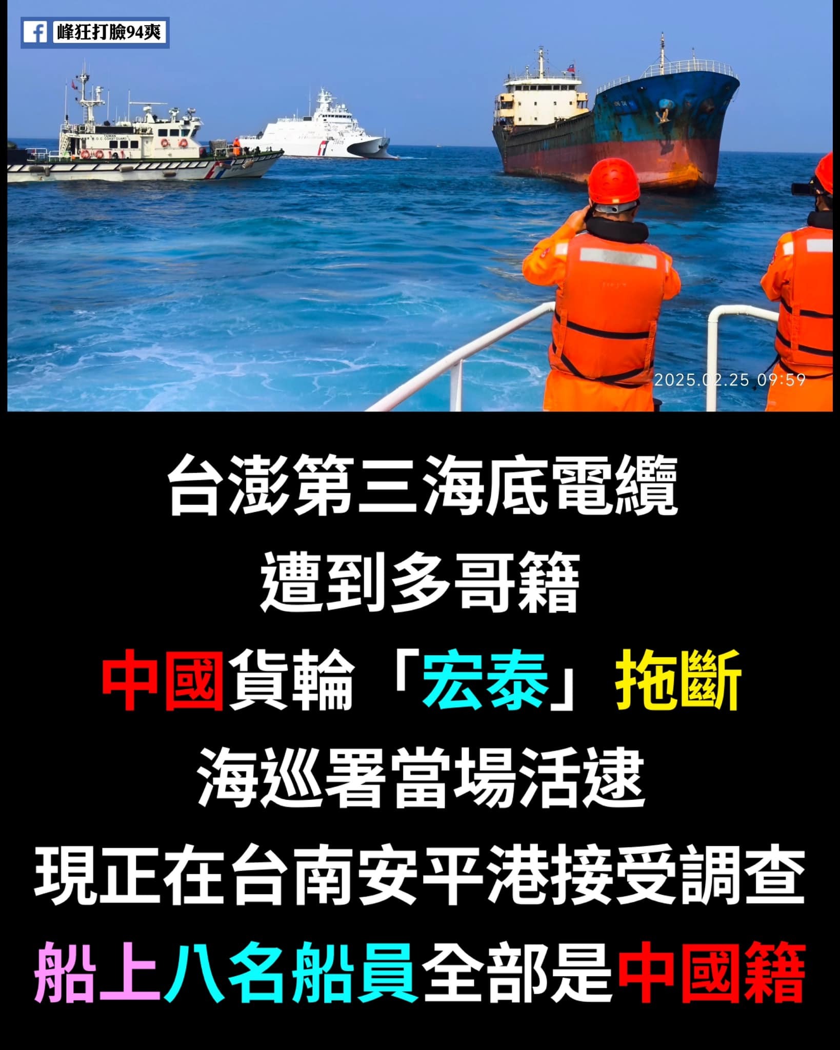 台灣在最近幾年,對外的海底電纜經常因為不明原因而被切斷,根據相關現場的船隻航行資料,相關單位懷疑是中資權宜船故意扯斷台灣的海底電纜,但一直苦於沒有當場的直接證據;終於,就在今天 (2025 年 2 月 25 日),我們當場逮到中資權宜船切斷台灣的海底電纜,船上八名船員全部都是中國籍。