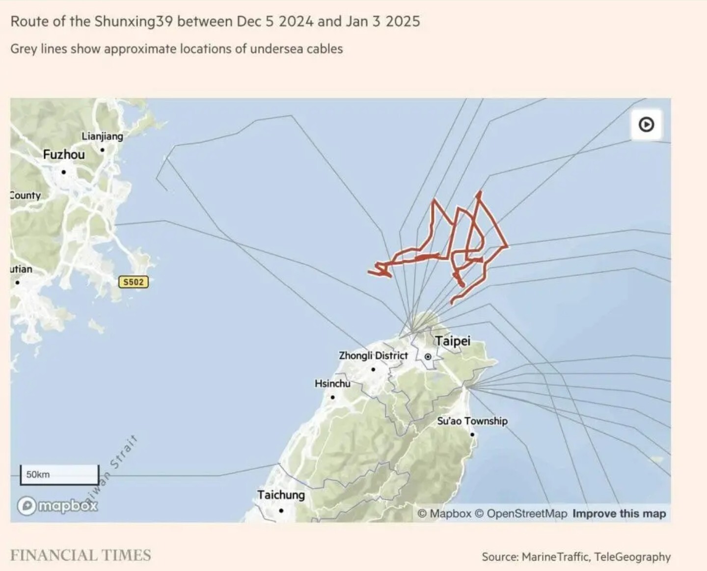 下列圖示,是 2024 年 12 月 5 日到 2025 年 1 月 3 日,總共 30 天的時間,中國權宜船順興 39 號在基隆外海來來回回的鋸齒狀行船路線圖(以紅色標示),圖中淺綠灰的線就是台灣對外的海底電纜。