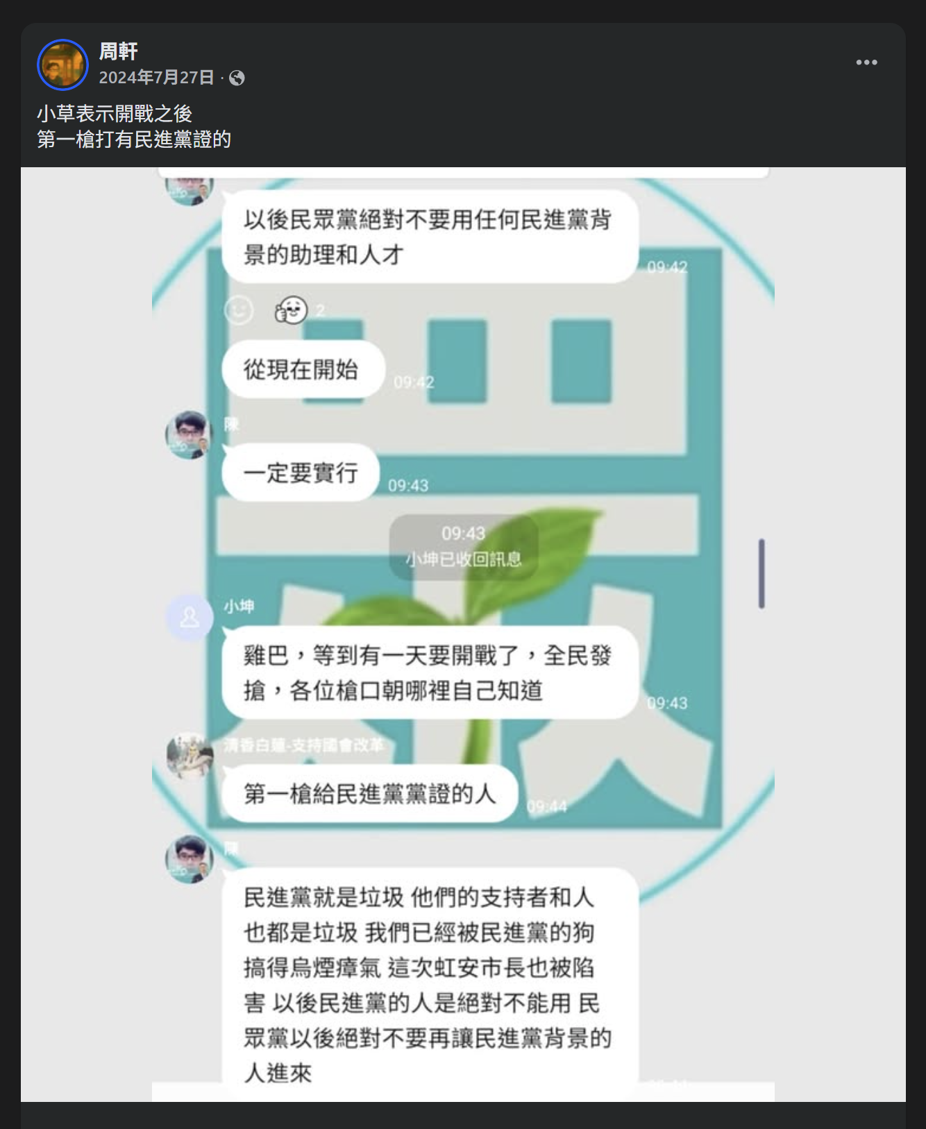 這貼文是 2024 年 7 月在民眾黨內部的群組裡出現,因為有民眾黨的支持者覺得言論不妥,所以被截圖流出,內容正是有小草們說中共侵略台灣,台灣政府發槍給全民之際,我們小草們拿到槍就要先槍殺有民進黨黨證的台灣人:
