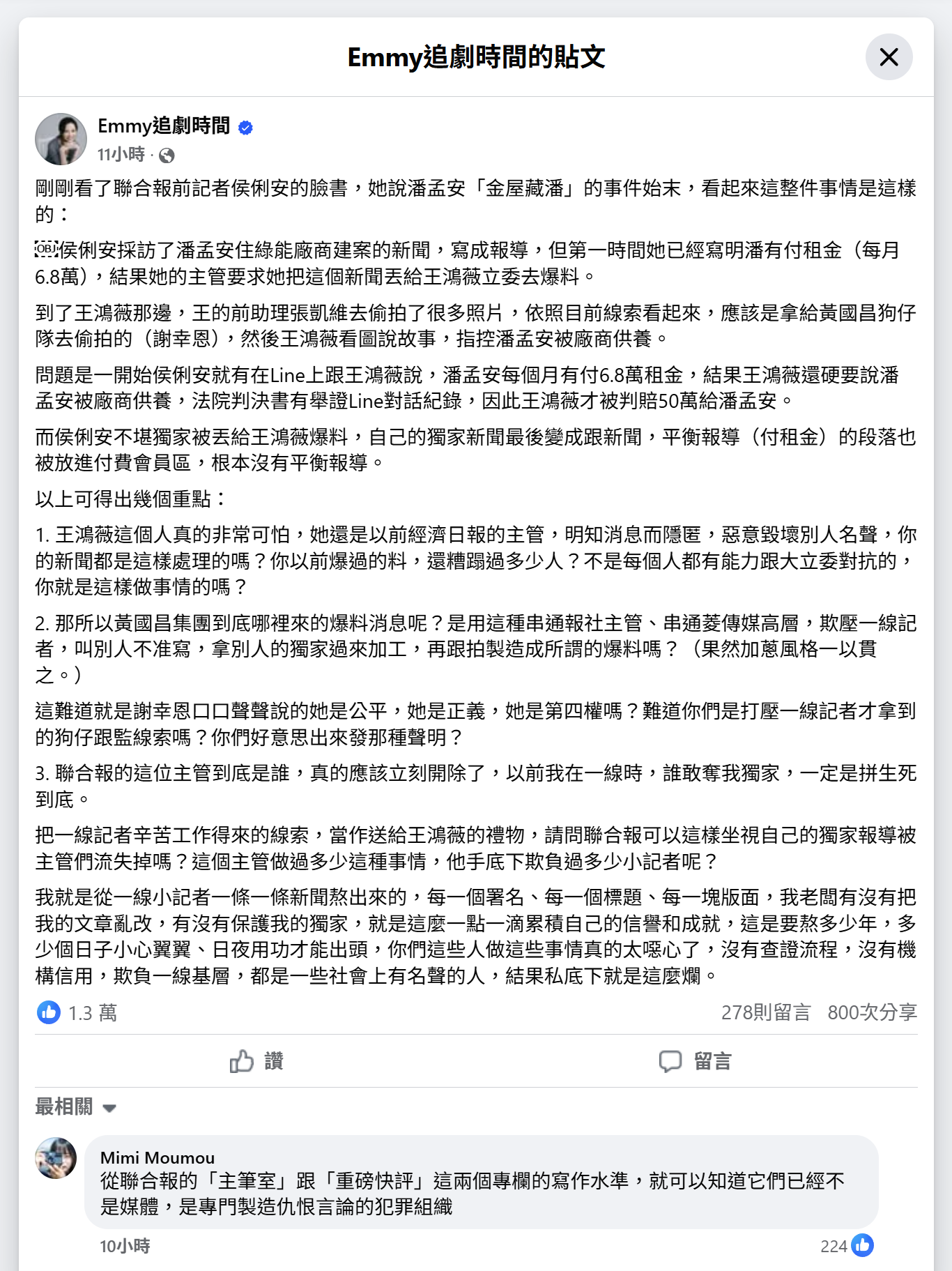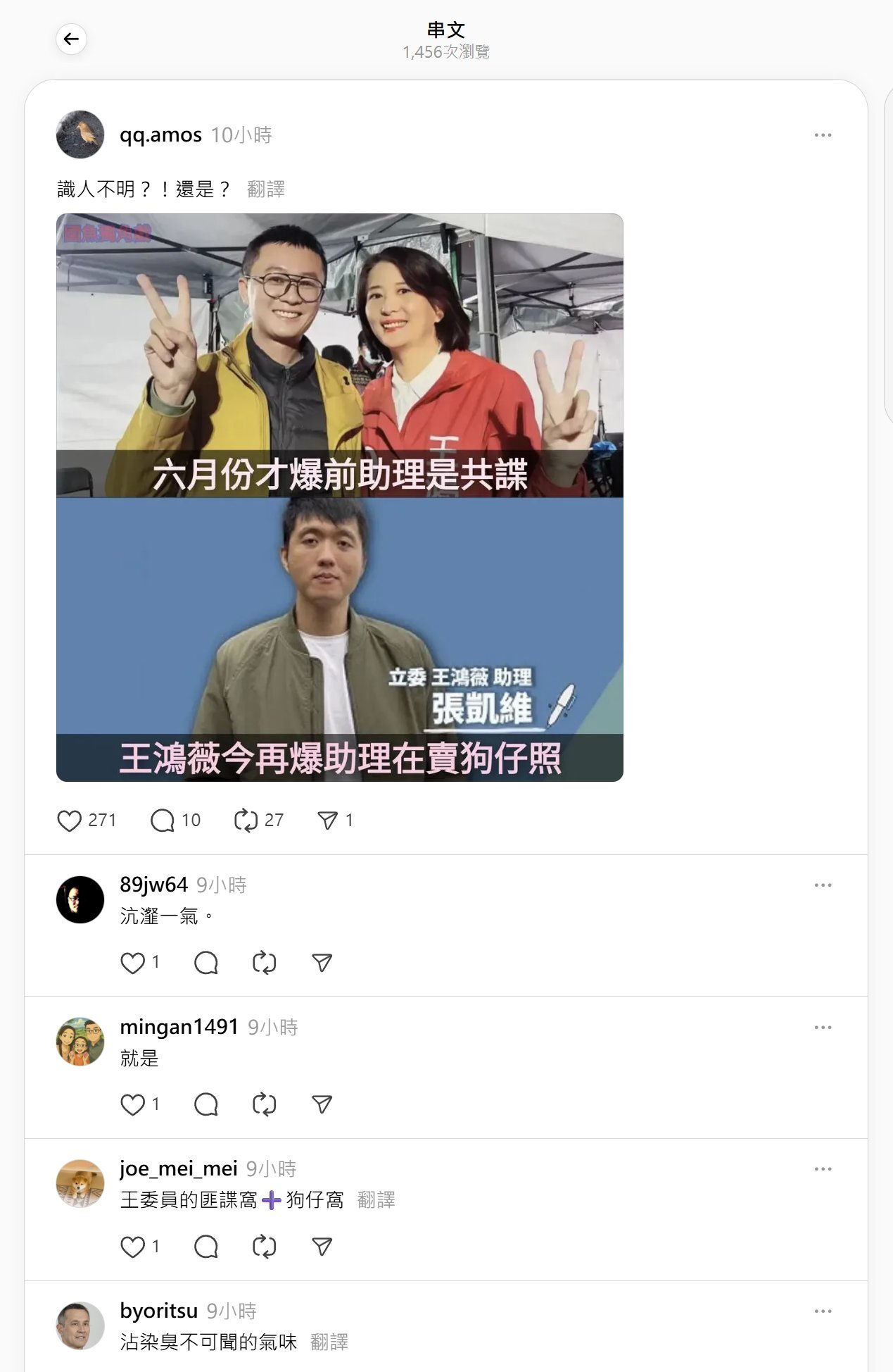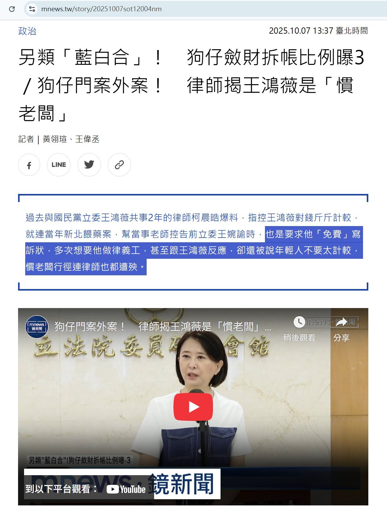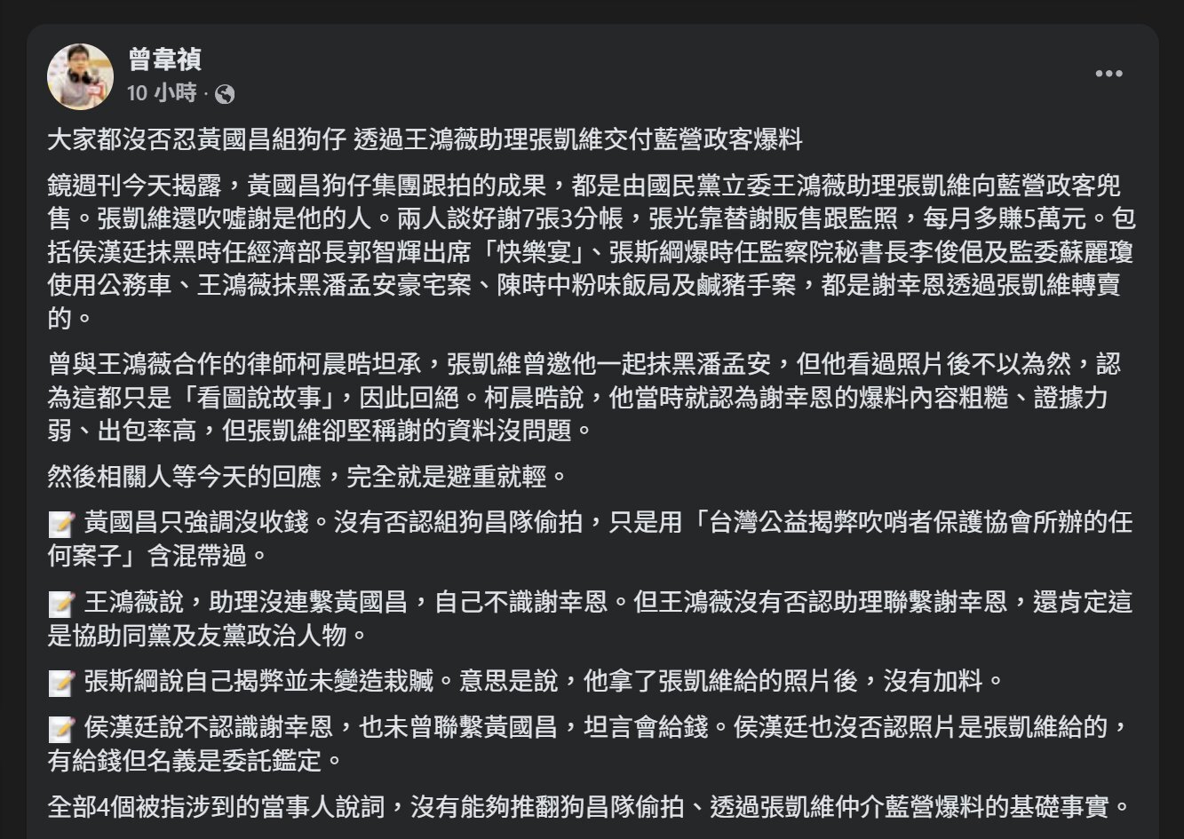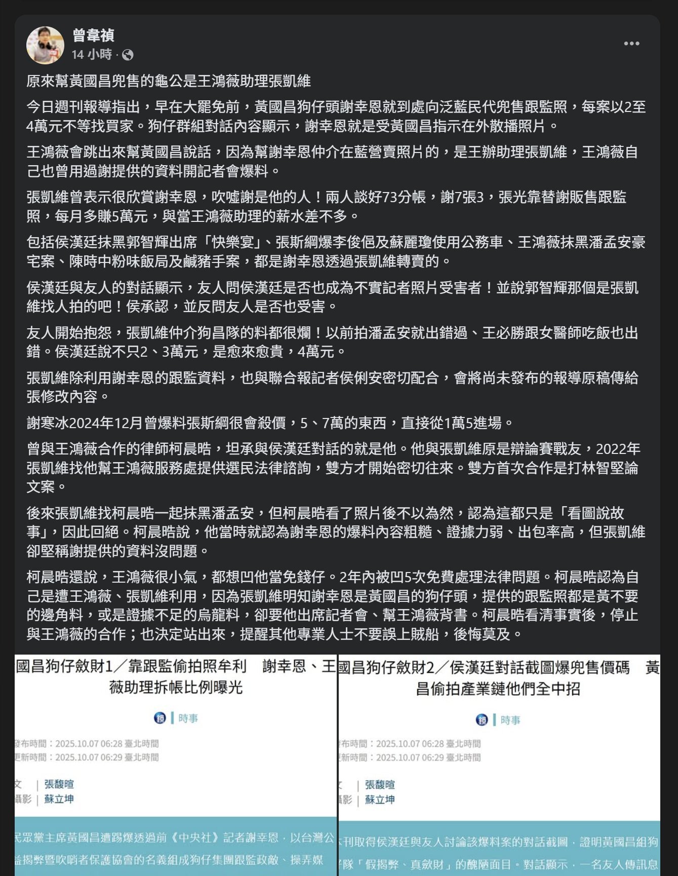 謝 7 張 3:黃國昌的狗仔謝幸恩拿七成,王鴻薇的助理張凱維拿三成。