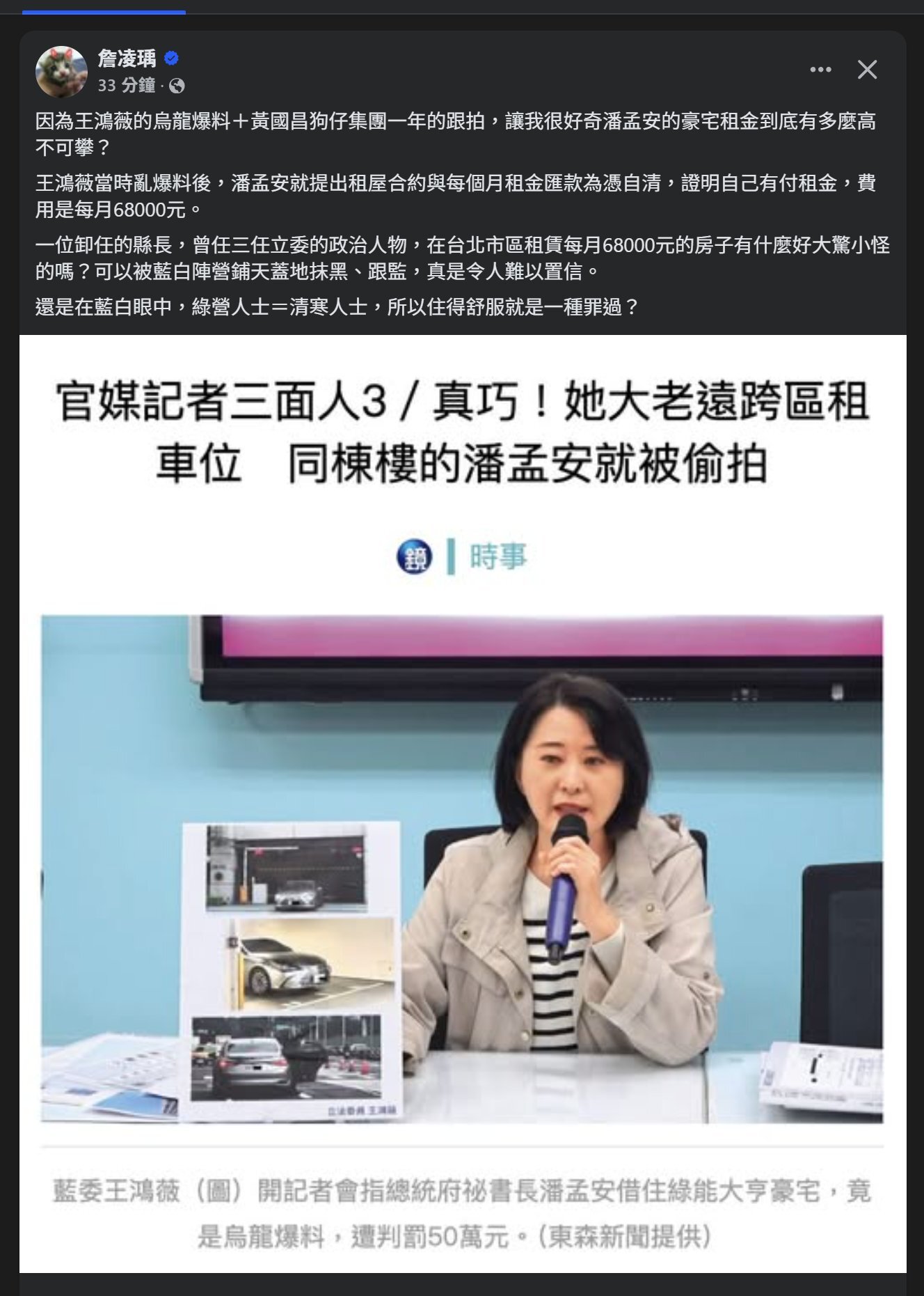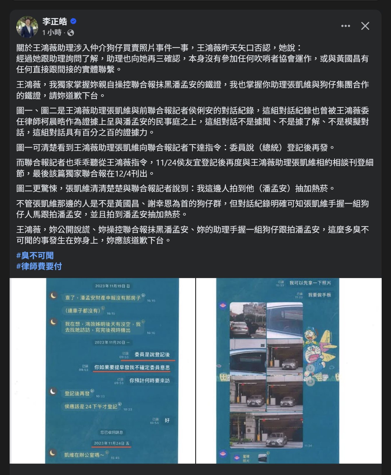 昨天 (2025 年 10 月 7 日) 爆出「咆哮昌的狗仔隊向藍營兜售照片、而藍營還幫忙賣」的新聞,今天 (2025 年 10 月 8 日),李正皓在他的臉書加碼爆料,他說藍營王鴻薇的助理張凱維不是只有幫忙黃國昌的狗仔隊賣照片而已,王鴻薇的助理張凱維也有自己的人馬在跟拍潘孟安!