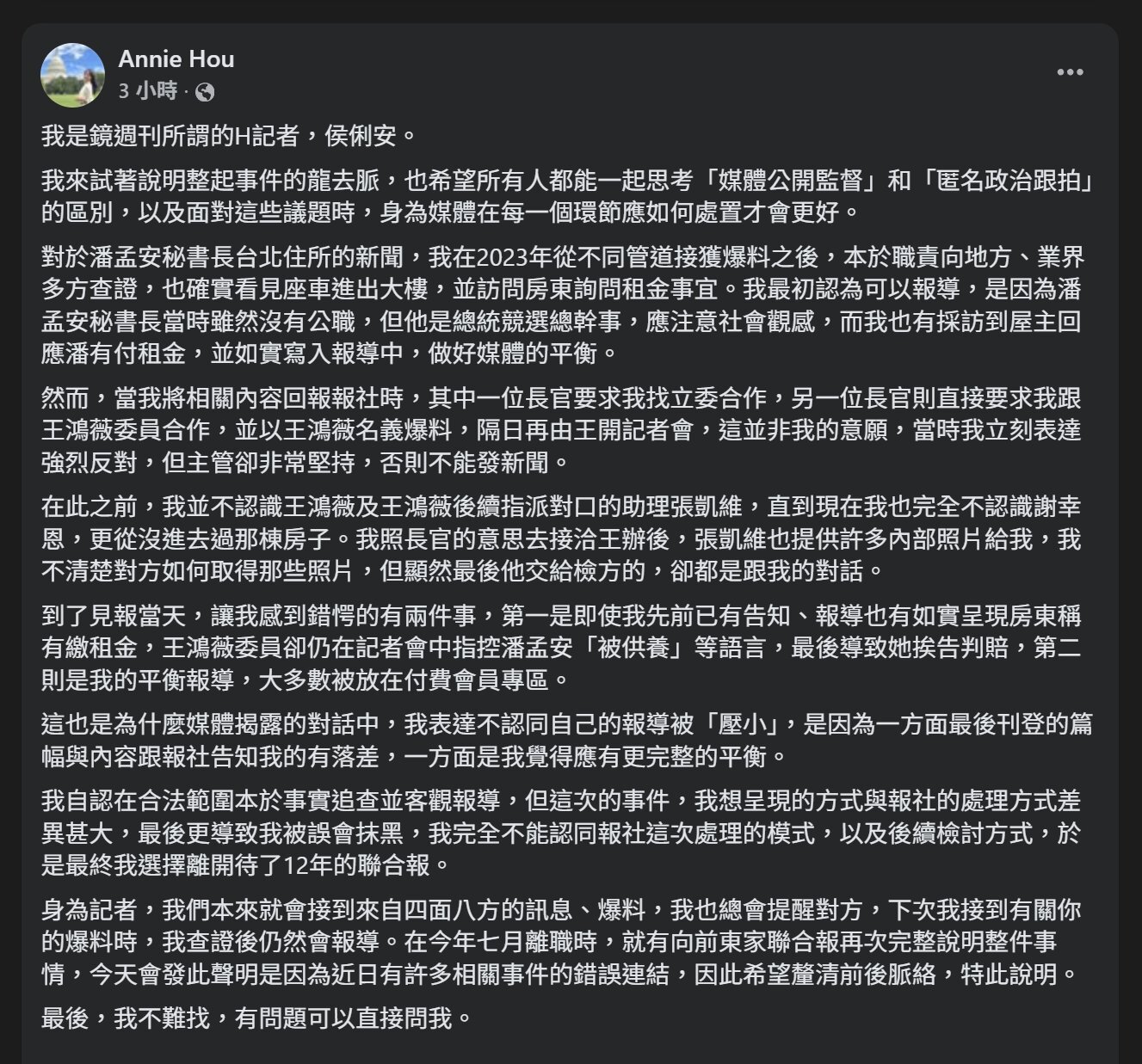 侯俐安是前聯合報的記者,在聯合報待了 12 年。