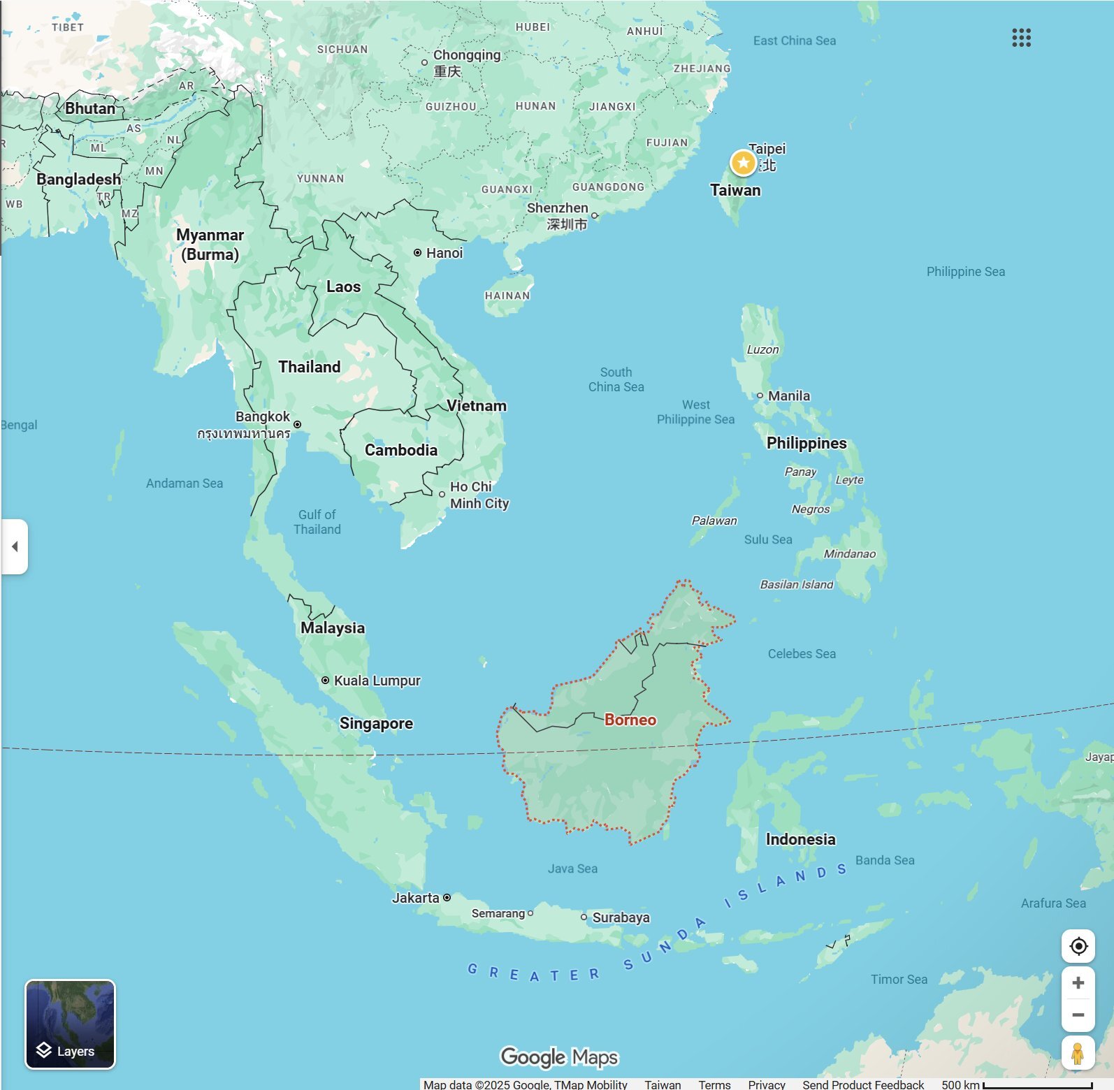 首先,先來看一下這史實發生地點的地理位置 — Borneo (婆羅洲);Borneo 的北半部大多數是 Malaysia 的領土,但其中還有一個小國家叫做 Brunei,而中部與南部則是 Indonesia 的領土。它是世界第三大島嶼,位於東南亞的中心地帶,橫跨赤道,擁有古老的熱帶雨林,是許多特有物種的棲息地,例如:紅毛猩猩、長鼻猴、以及婆羅洲雲豹等等。