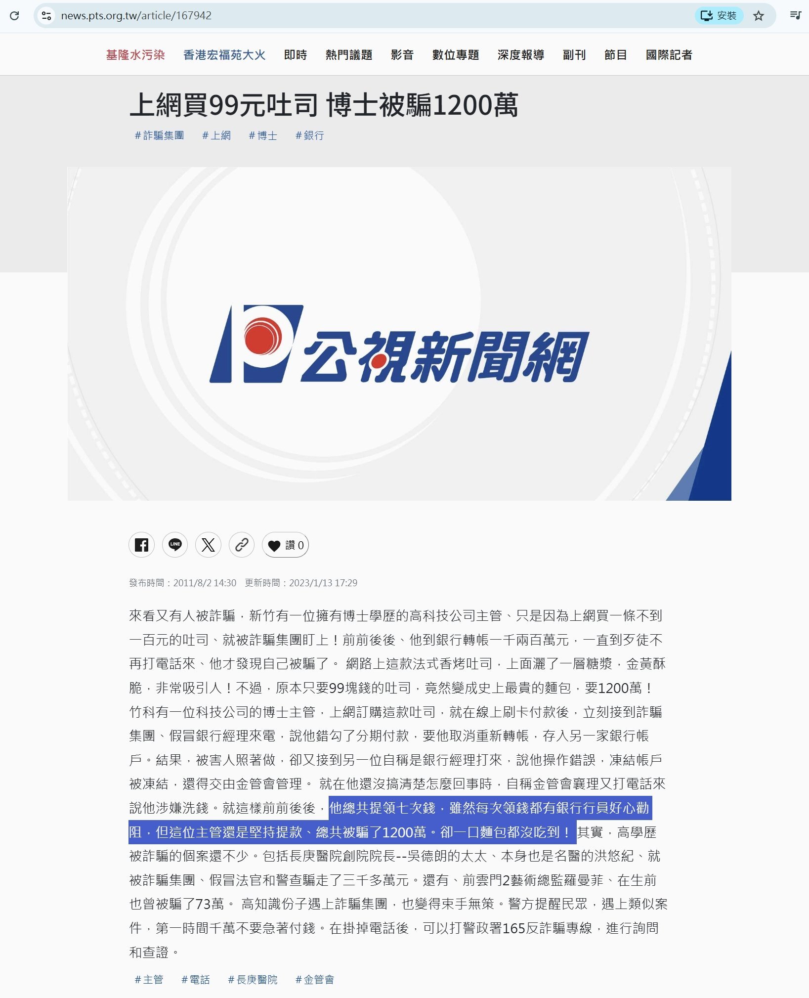 還記得 2011 年有位具有博士學歷的竹科主管為了買 99 元麵包而被騙走 1200 萬嗎?貼出來讓各位複習一下:有些人就是會被騙,儘管銀行行員勸阻了七次,他還是七次選擇被騙!