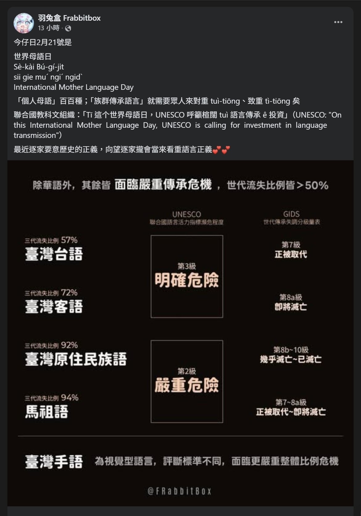 世界母語日,又稱國際母語日,這個節日由聯合國教科文組織(UNESCO)在 1999 年提出,並自 2000 年起開始每年舉行,目的是促進語言多樣性、保護母語,避免世界各地的語言逐漸消失。今天是 2026 年 2 月 21 日,也就世界母語日,因此筆者來分享一下東亞陸塊的母語分布以及台灣各母語的瀕危程度。