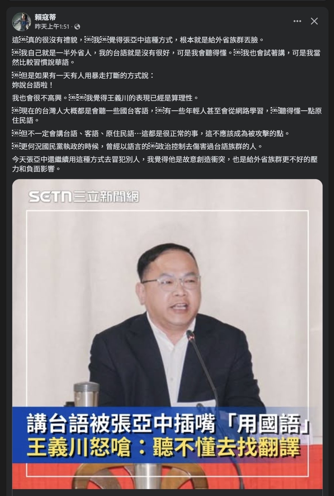 樓主賴寇蒂是位有台灣主權意識的平民外省人後代,但她應該是誤解了大多數外省人的 mindset;擁有「高級外省人 mindset」的族群,根本不會認為「打壓其它族群的母語」是件丟臉的事情,樓主的自我映射不適用於高級外省人族群,而這群高級外省人族群,並不侷限於權貴外省人,許多平民外省人也有這種「我是高級外省人 mindset」。