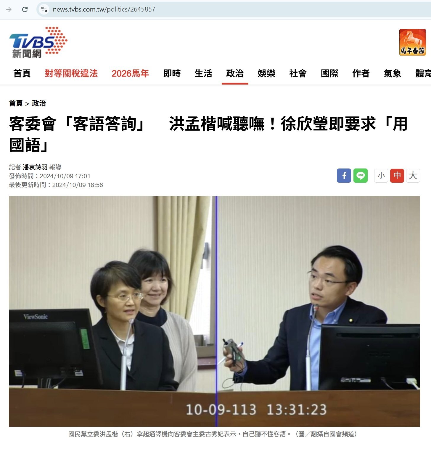 2024 年 10 月 9 日,立法院的內政委員會,客委會主委使用「客語」回答國民黨立委洪孟楷的詢問,其它聽不懂客語的內政委員會立委都戴著立院所準備的翻譯耳機聽翻譯,就只有洪孟楷不肯戴,還當面要求客委會主委使用「國語」回答,更扯的事情是,新竹縣國民黨的客家立委徐欣瑩還為洪孟楷幫腔,公開要求客委會主委使用「國語、華語」回答 (召委徐欣瑩裁示客委會主委必須用「國語」發言,不得以「客語」發言)。