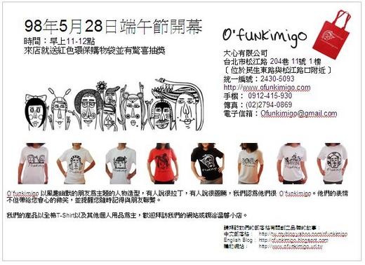 終於,我們決定在端午節早上11-12舉辨一個簡單的開幕活動,在此邀請喜歡O’funkimigo的朋友到場跟我們一起熱鬧。來店就送超人氣的紅色環保購物袋,現場並有O’funkimigo設計師為您手繪 O’funkimigo人物像,結束前還有驚喜禮物抽獎。