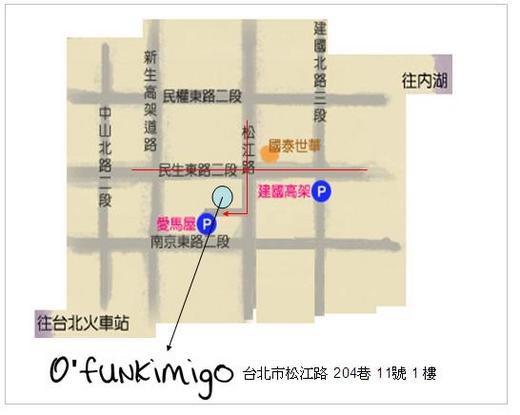 頭獎:O’funkimigo驚喜禮一份﹝不能說的秘密喔!﹞ 地址:台北市松江路 204巷 11號 1 樓 (請看地圖) 地點是在松江路與民生東路口,路口是星巴克,隔壁是一家 7-11,文具店,然後是御書園的入口處,旁邊就是204巷,(對街是救國團) 走進去約80公尺,右手邊找11號1樓,綠色的門,即是 Ofunkimigo Shop。 公車族:站名『救國團』,請看公車地圖。 捷運族:捷運淡水站 捷運中和站 - 捷運雙連站 轉搭226 / 518號公車至《救國團》