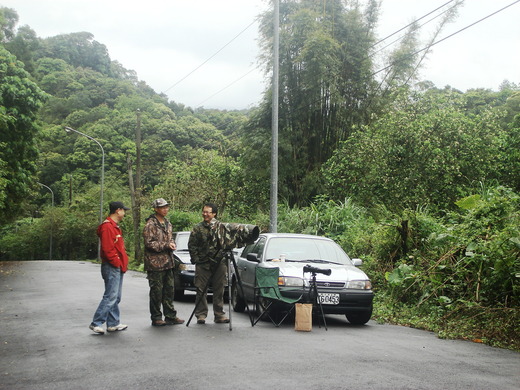 走到一半,聽見鳥叫聲,走進一看,原來是三位賞鳥攝影家在吹口哨引鳥。老公問他們再等哪一種鳥?『山紅頭』,其中一位先生回答道;老公又問,為何選在這個點『等鳥』?其中一位先生說,只因為牠們在這裡出現過。有一位賞鳥攝影家拿出他的 iPod,裡面灌滿了各種鳥叫的聲音,他選了一種鳥叫聲,放出聲來,繼續引鳥。