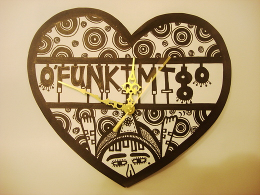 O’funkimigo想試看看,如果把我們的人物放到時鐘上,會是什麼樣?於是,決定動手做一個圓型,一個心型,圓型是希望一切圓滿,心型是因為我們的公司叫做『大心公司』。