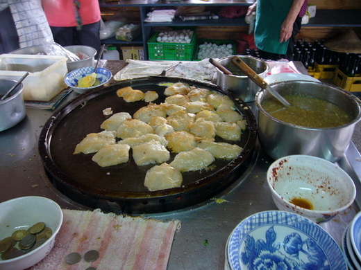 以磨成粉的米、做成一小塊的粿,以鐵板油煎,可加蛋一起食用,吃的時候淋上獨家醬料,早中晚點心宵夜皆可。