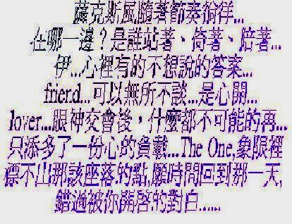 文字,或只是個妝扮,組合成一幅心裡想要的圖,那被旋律牽引出的畫面,不正是現代男女間的迷濛,有一些唇齒間的不能說,下了眉頭,被一一放在心頭。