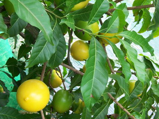 ‧特性: | 黃金果為多年生常綠性喬木,樹皮灰色棕色,老莖有不規則剝落痕;枝葉及幼果均會分泌白色膠狀乳汁;株高可達 2 公尺以上,枝梢細長下垂。葉互生,長 10~20 公分,寬 3~6 公分,長橢圓形,嫩葉淡綠,成熟葉轉呈深綠色,全緣,先端鈍尖,葉表光亮。花為兩性花,花小,花梗甚短,單生或 2~9 花簇生於分枝或主幹上。花瓣 4~5裂,淡綠色,長 0.4~0.8 公分,花柱短,可自花授粉,大多在夜間(6:00~8:00)開放,少數花在早上6:00開放,開花期有特殊香氣,為蟲媒授粉。果實形狀因品系及結果期而異,呈長卵圓、橢圓或圓形;幼果皮深綠色,有少許絨毛,成熟時果皮轉呈光滑鮮豔明亮之金黃色,果頂平整或微尖;果重 100~900g,果徑 7~11 公分;果肉乳白色,半透明狀,皮肉不易分離,未熟果或近皮部會有膠狀乳汁,食之帶澀味,成熟果則味甜,平均甜度 12~15°Brix,無酸味;果肉質地與風味,品種間差異極大,有極甜至淡而無味者。種子 1~4 粒,單粒種子重約 5~6g,長 3~4 公分,黑褐色或深褐色,外有膠質物。 |