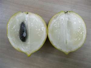 | ‧果實: | 果實形狀因品系及結果期而異,呈長卵圓、橢圓或圓形;幼果皮深綠色,有少許絨毛,成熟時果皮轉呈光滑鮮豔明亮之金黃色,果頂平整或微尖;果重 100~900g,果徑 7~11 公分;果肉乳白色,半透明狀,皮肉不易分離,未熟果或近皮部會有膠狀乳汁,食之帶澀味,成熟果則味甜,平均甜度 12~15°Brix,無酸味;果肉質地與風味,品種間差異極大,有極甜至淡而無味者。種子 1~4 粒,單粒種子重約 5~6g,長 3~4 公分,黑褐色或深褐色,外有膠質物。 |