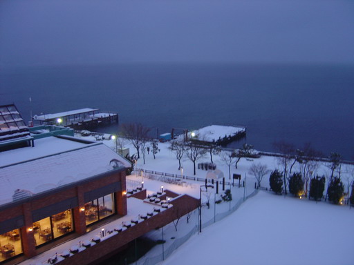 擷取畫面中奇異的藍色光彷彿要溢出來了。燈火通明的是飯店的餐廳,從落地窗可以直接欣賞洞爺湖的風光。這西式的飯店地點超好的,後門就可以通到遊船的碼頭,可惜時刻已晚,湖上空落落的,沒有人跡。